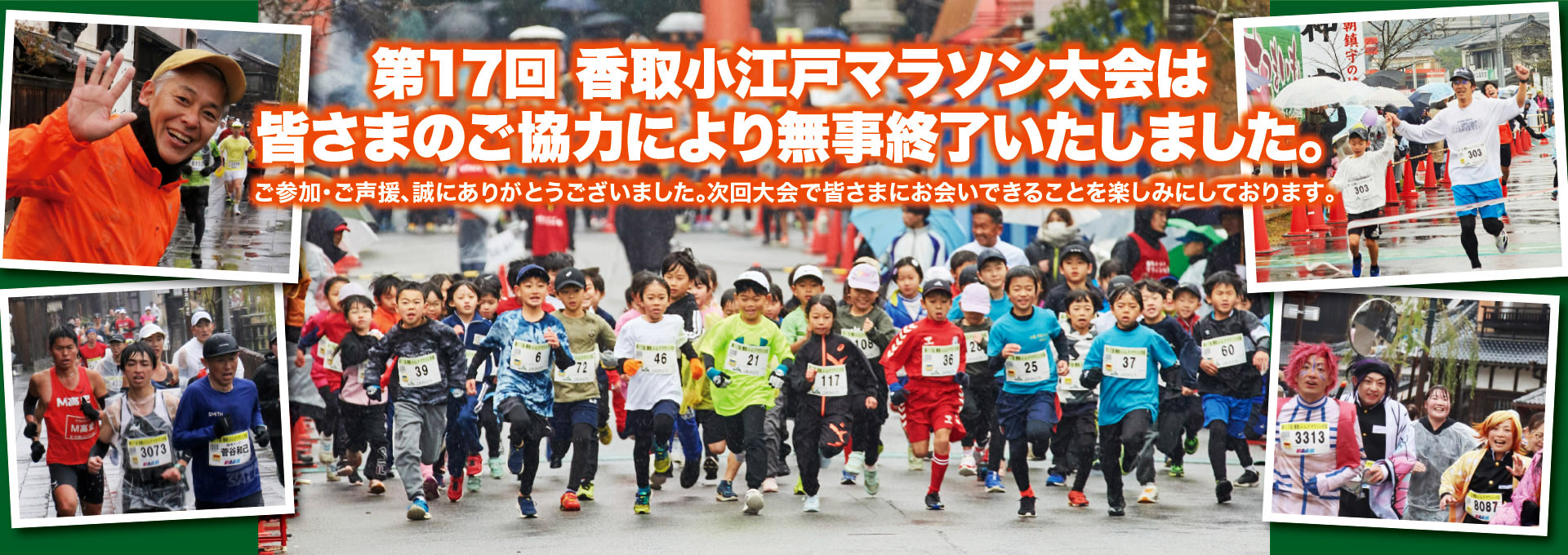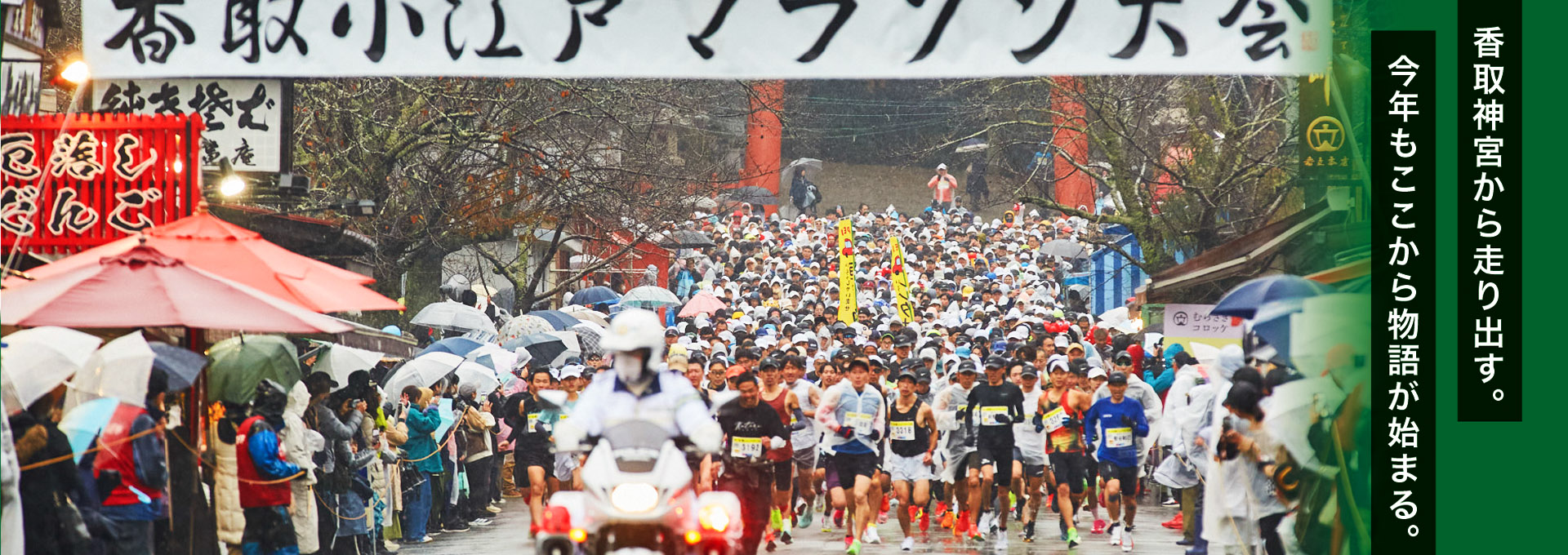 勝負の神宿る香取神宮を舞台に、小学生から一般まで男女年代別21部門で開催します。10Kmでは、日本遺産に認定された江戸情緒漂う歴史的な町並みを駆け抜けます。